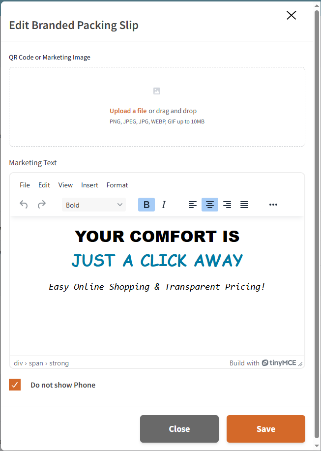 Ask your account manager to enable branded packing slips and we will print out your marketing material within the shipping label within the box. You can edit the contents within your command center under Marketing>Branded Packing Slips.