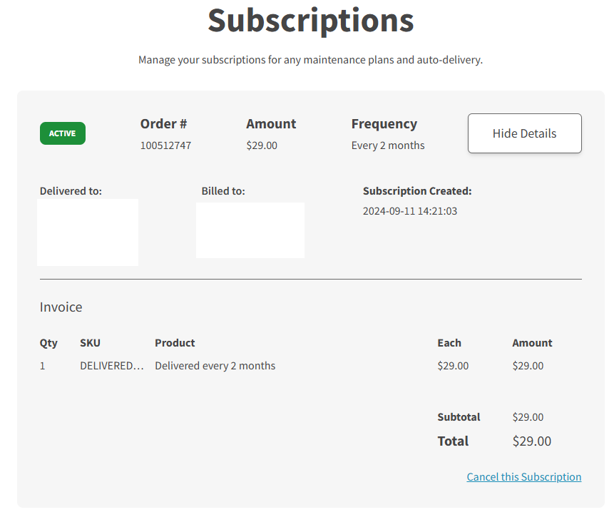 From this page, customers may see the details of their subscriptions, as well as cancel them:
