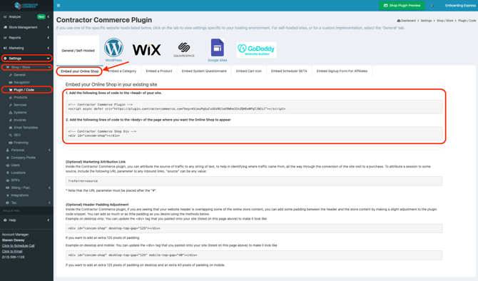 The Contractor Commerce Shop plugin code can be accessed anytime after you sign up by visiting the Contractor Commerce Dashboard and navigating to Settings > Shop/Store > Plugin/Code